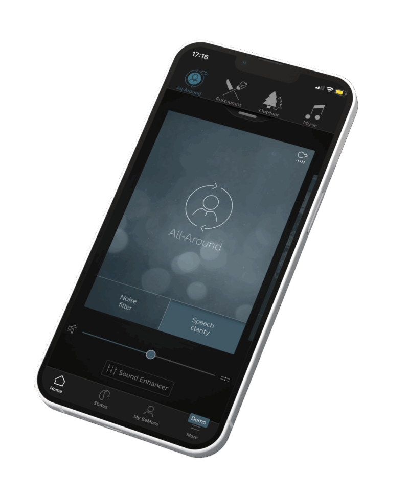 The BeMore hearing aid app for Android and Apple devices allows you to discreetly control and personalise your hearing aids. All without touching and drawing attention to your hearing device. It has never been more intuitive, making it easy for you to personalise your hearing experience even further. The hearing app is free to download on App Store or Google Play.